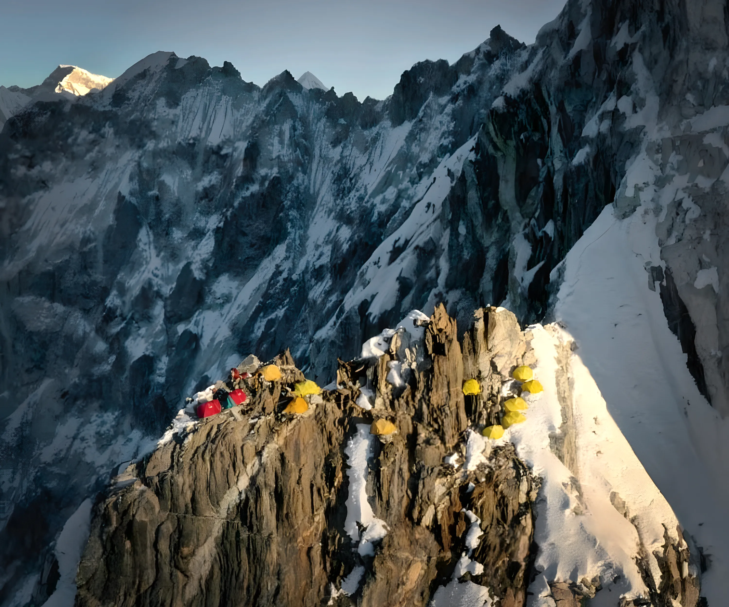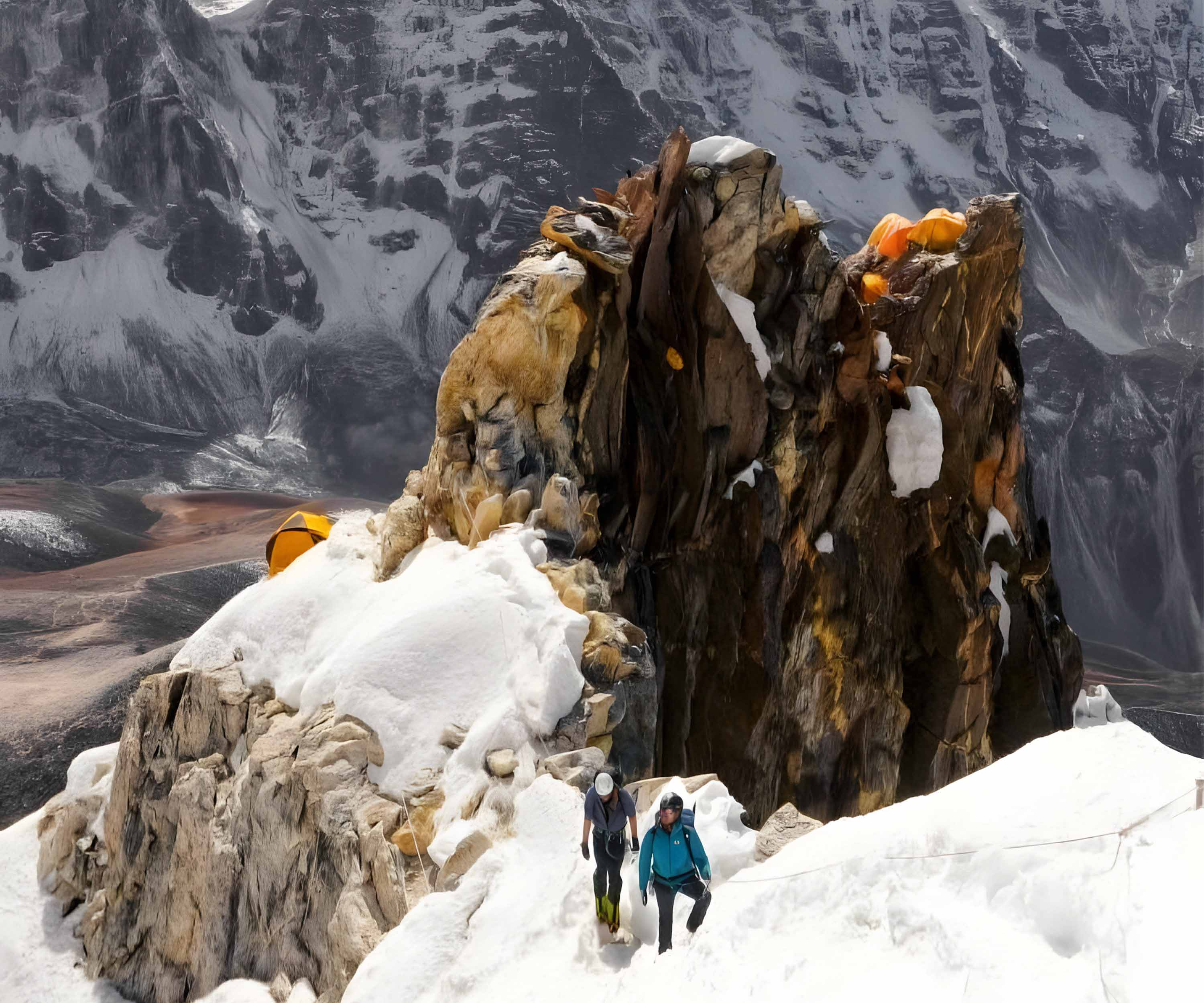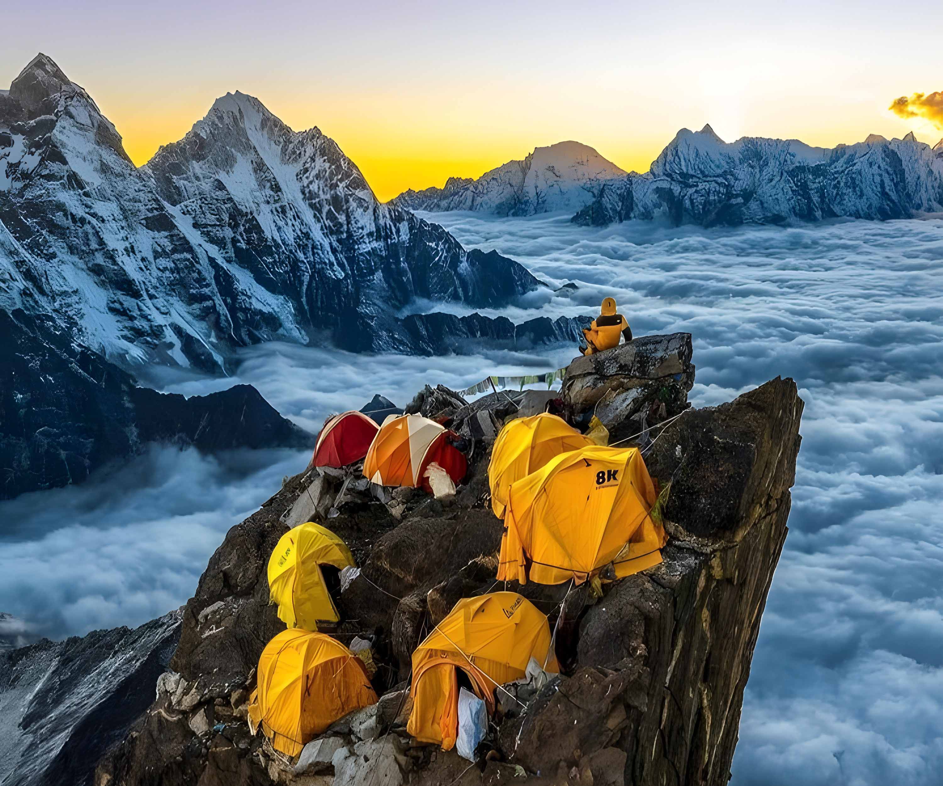 - Camp II (6,000 m): It is on the ridge just above a rock outcrop called the Yellow Tower. Due to the limited space, climbers directly go to Camp III and return to base camp to rest.