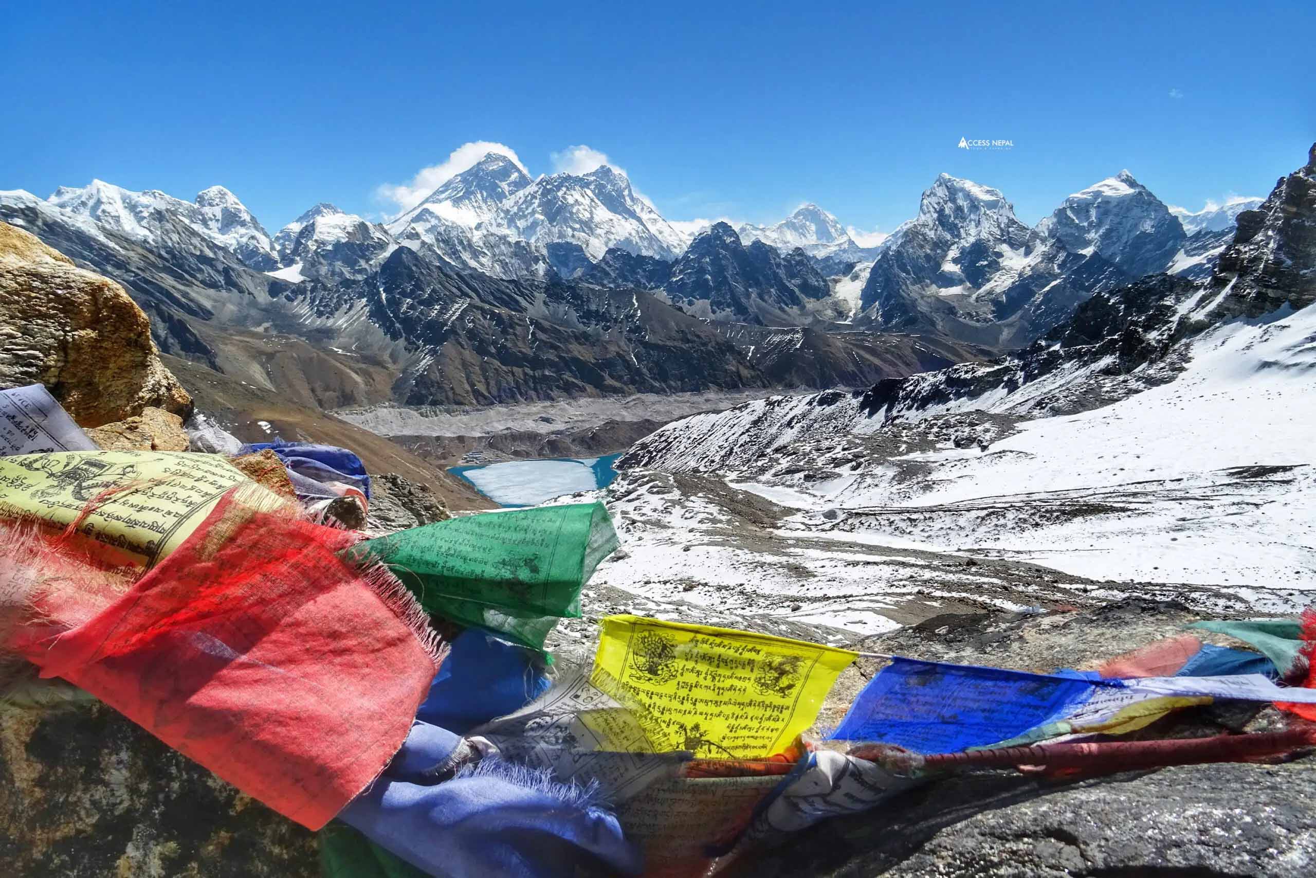 La parte central del Trek al Lago Gokyo es la cima de Gokyo Ri, a una altitud de 5,357 metros. Es un mirador popular desde donde se pueden ver cuatro de las montañas más altas del mundo: