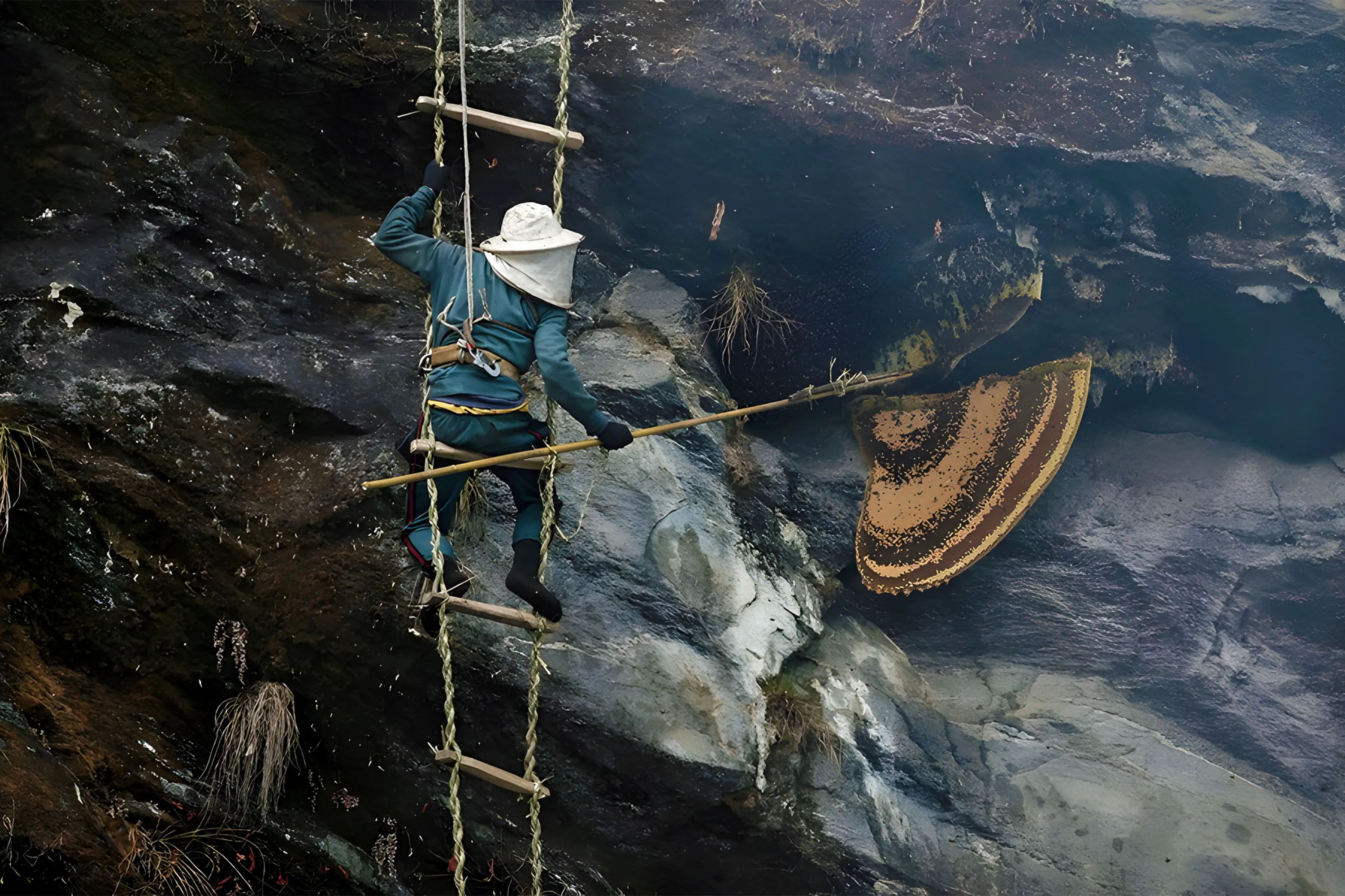 - Climb the cliff: Then the lead hunter climbs the cliff using the bamboo ladder and ropes. This process is very risky and just a sight of it shakes you. They climb smoothly with little safety gear in bare feet or simple boots.